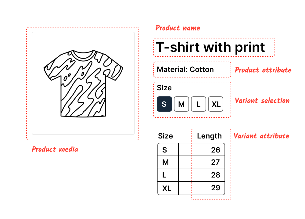 Let's recreate a sample T-shirt product in Saleor. The product is T-shirt that comes in different sizes, where each size has a different price and length description.